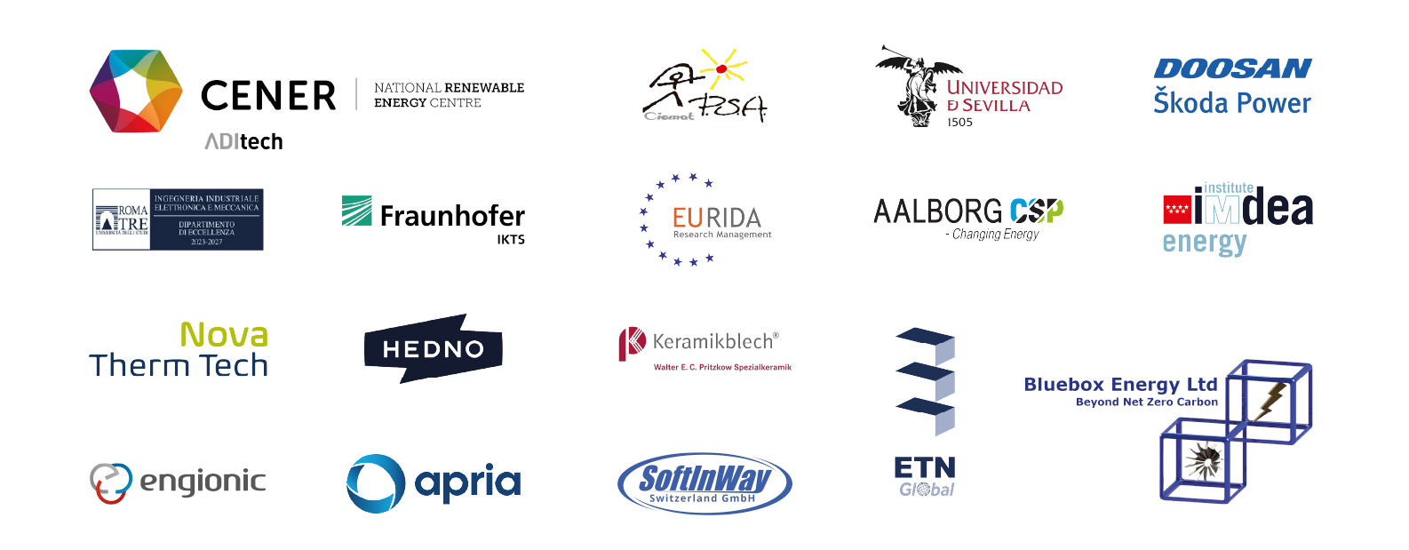 Fundación CENER, CIEMAT, Universidad de Sevilla, Doosan Skoda Power SRO, Universita Degli Studi Roma Tre, Fraunhofer, Clancy Haussler Rita, Aalborg CSP AS, European Turbine Network, Fundación IMDEA Energía, Innovation therm technologies SL, Pritzkow Walter Erich Christian, Diacheiristis Ellinikou Diktyou Dianomis Elektrikis Energeias AE, Engionic Femto Gratings GMBH, Apria Systems SL, Softinway Switzerland LLC, y Bluebox Energy LTD.