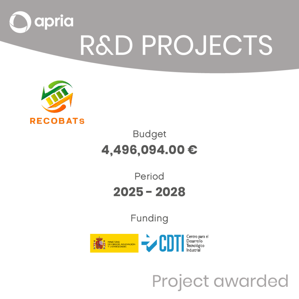14 de January de 2025 14 de January de 2025Awarded the Recobats projectThe project Recobats has been awarded with CDTI funds.