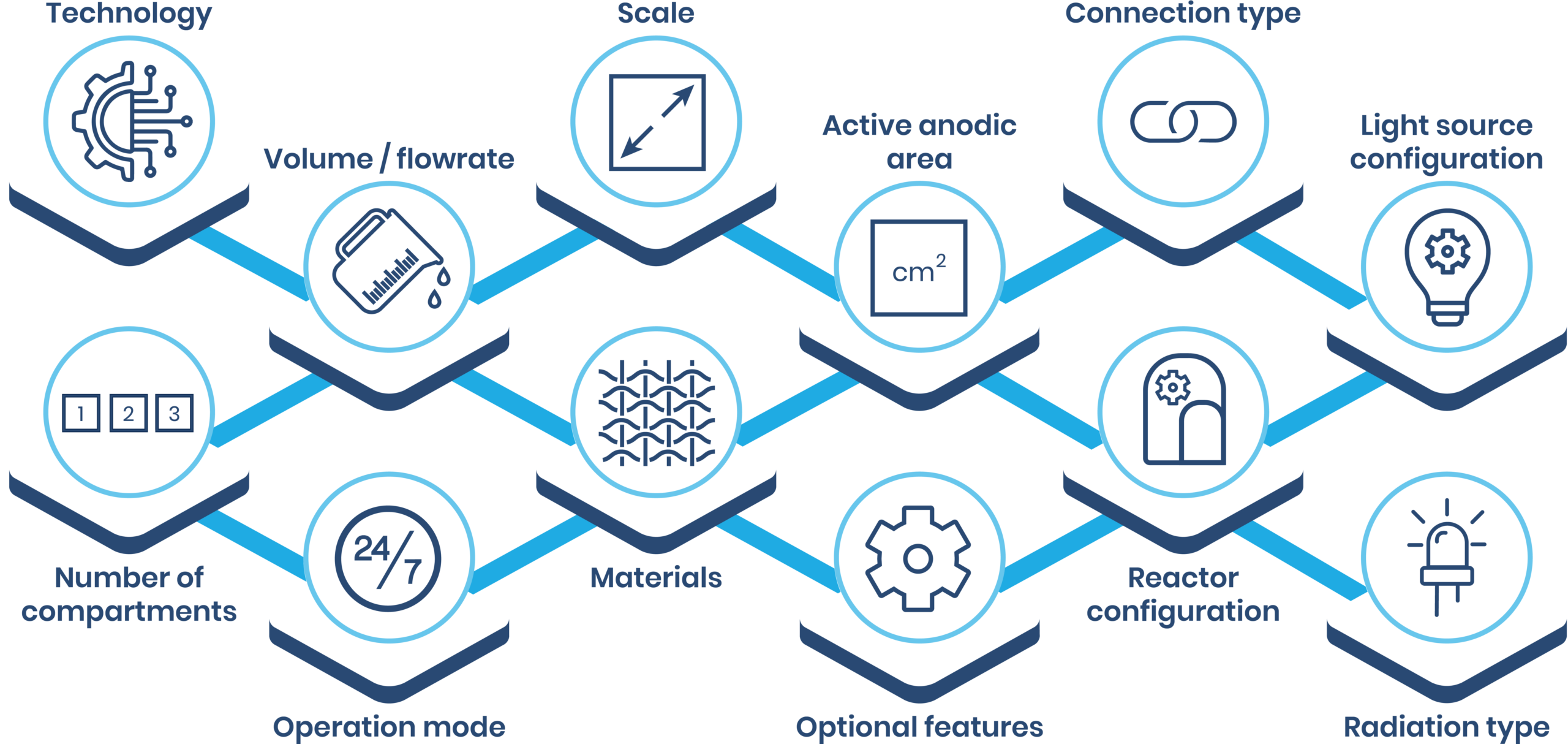 Besides, in our photoelectroreactors, the active anodic area, the geometry and the material of the electrodes (BDD, carbon felt, IrO2, Ni, PtOx, RuO2, stainless steel, Ti, etc.) can be adjusted to your needs.