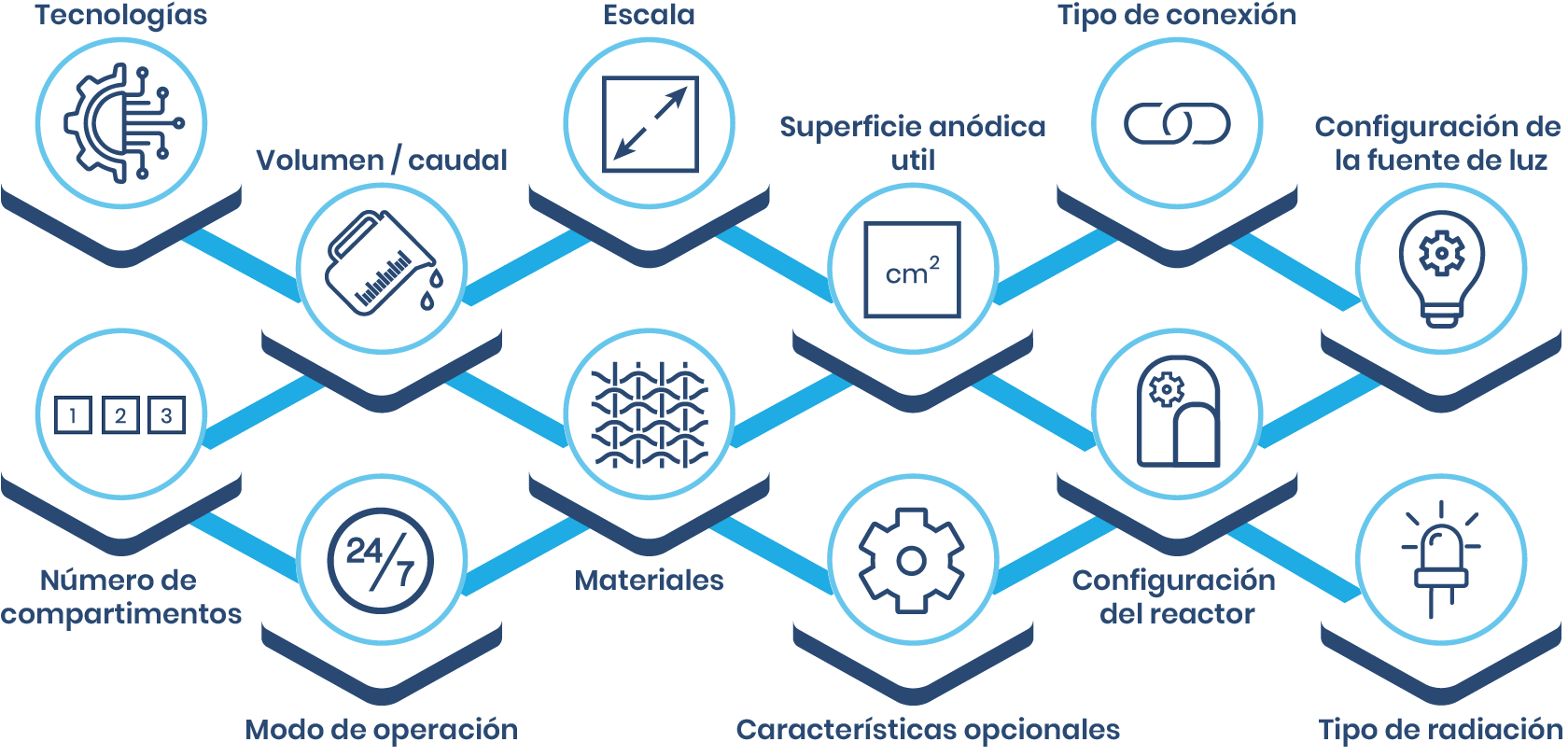 Además, en nuestros fotoelectrorreactores es posible seleccionar el área anódica activa, la geometría y el material de los electrodos (acero inoxidable, BDD, carbon felt, IrO2, Ni, PtOx, RuO2, Ti, etc.).